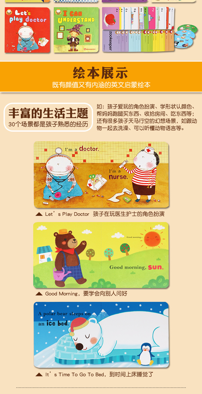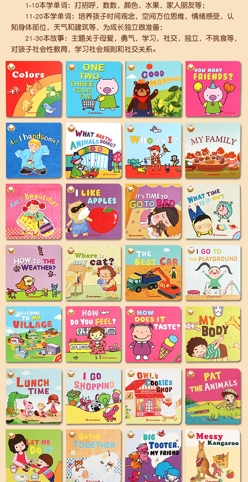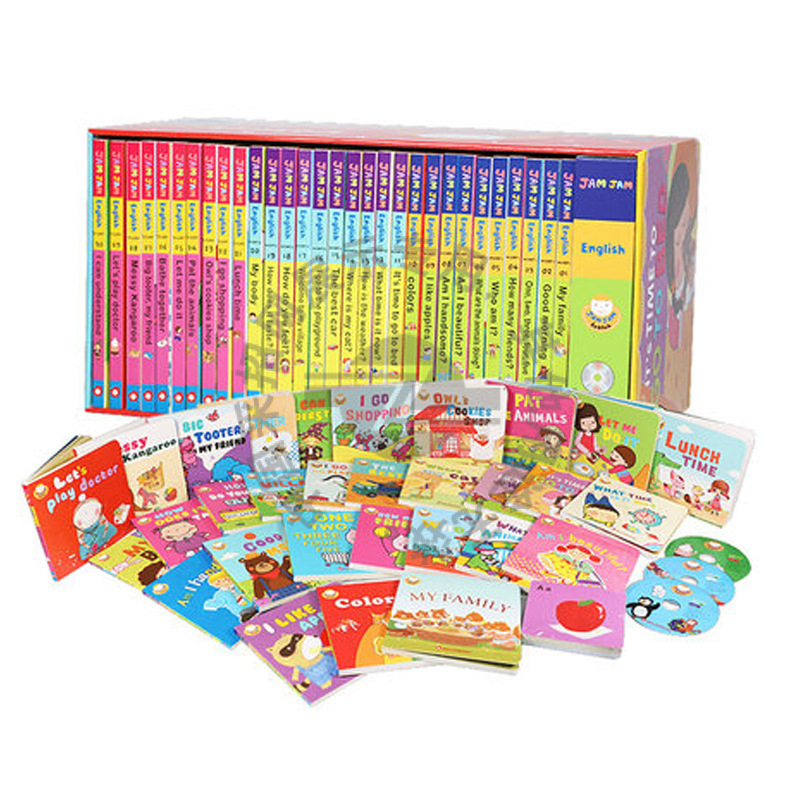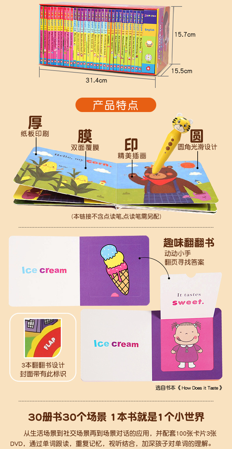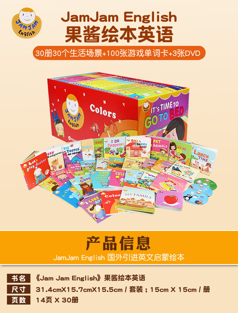 果酱英语JamJam English,国外引进的英文原版启蒙绘本,支持点读。共30册,分成3个阶梯,每10册一个进阶。精装纸板,圆角设计,安全耐用。简单易懂的句子和生动形象的绘画,还有趣味十足的小翻页设计,适合2-5岁的宝宝做英语启蒙。