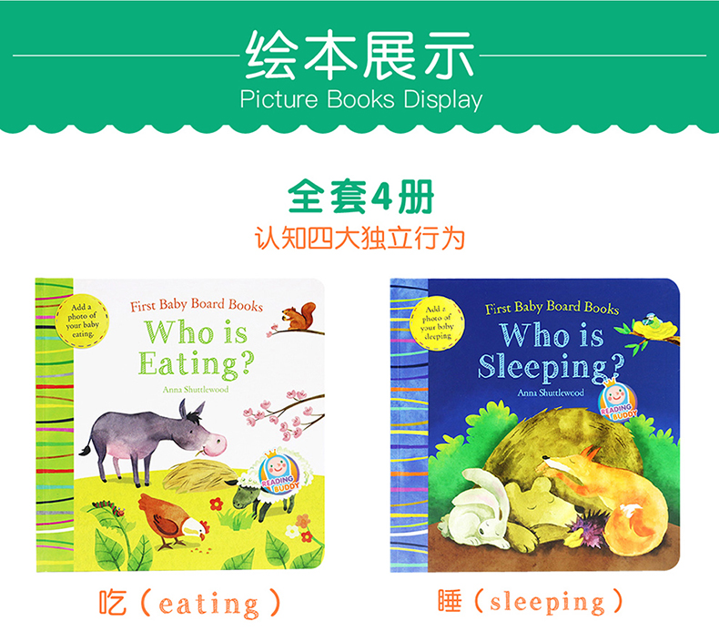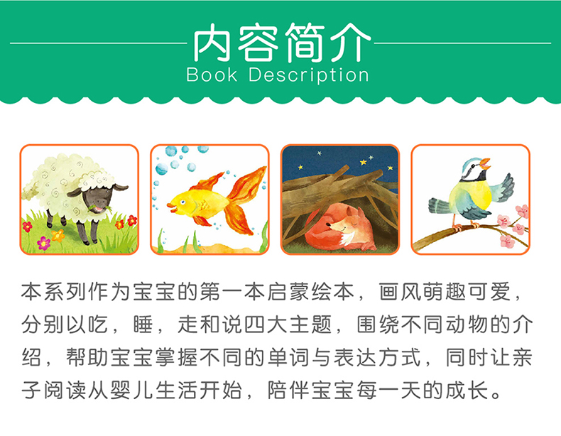 本系列作为宝宝的第一本启蒙绘本,画风萌趣可爱,分别以吃,睡,走和说四大主题,围绕不同动物的介绍,帮助宝宝掌握不同的单词与表达方式,同时让亲子阅读从婴儿生活开始,陪伴宝宝每一天的成长。